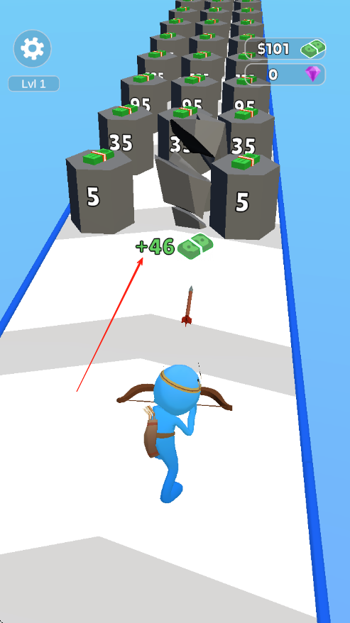 2、操控队伍前进,撞开带有金钱标识的障碍物,收集如红箭头所指的金钱【+46】,增加游戏货币。