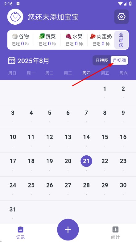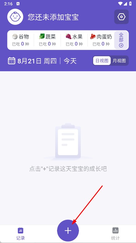 1、打开宝宝记录,点底部加号,可记录宝宝奶量、辅食、排便等成长情况。