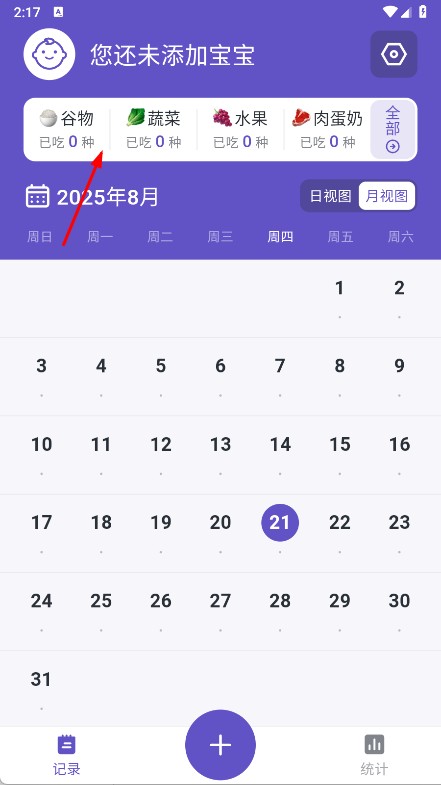 2、切换月视图,按日期管理记录,点顶部谷物等分类,查看对应食物摄入统计。