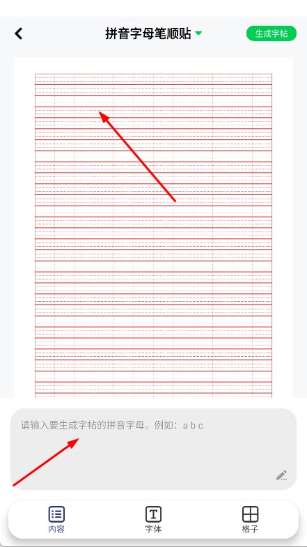 2、选择拼音字帖,进入拼音字母笔顺贴界面,在输入框填写要生成字帖的拼音字母。