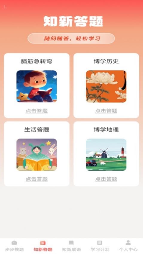 步步知新凭借多元搜题功能、全领域题库资源与系统的成语学习体系,用精准搜题解决即时学习需求,靠趣味答题与成语积累拓展知识边界,通过学习计划功能规范学习节奏,让知识获取从被动查询变为主动探索,无论是学生日常作业解惑,还是成年人拓展文化素养,都能在这里获得适配的学习支持。