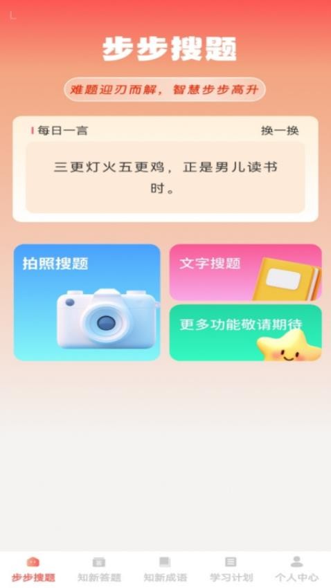 步步知新是一款整合搜题和答题与成语学习与计划管理的多功能学习工具,聚焦全场景知识获取与能力提升,支持文字、拍照等多元搜题方式,搭配多领域题库资源与成语积累功能,在搜题解惑的同时,通过趣味答题拓展知识边界,积累成语词汇,同步提供学习计划管理功能,助力高效规划学习节奏,是兼顾实用性与趣味性的综合学习平台。
