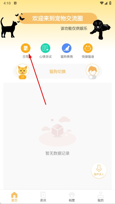 1、打开猫狗食谱,进入宠物交流圈,点击日常功能。