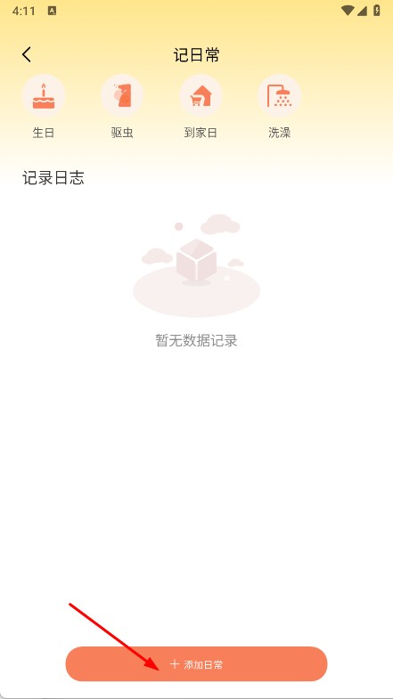 2、在记日常页,点加添加日常,选记录类型,如生日、驱虫等,若选其他日常,在输入框填内容。
