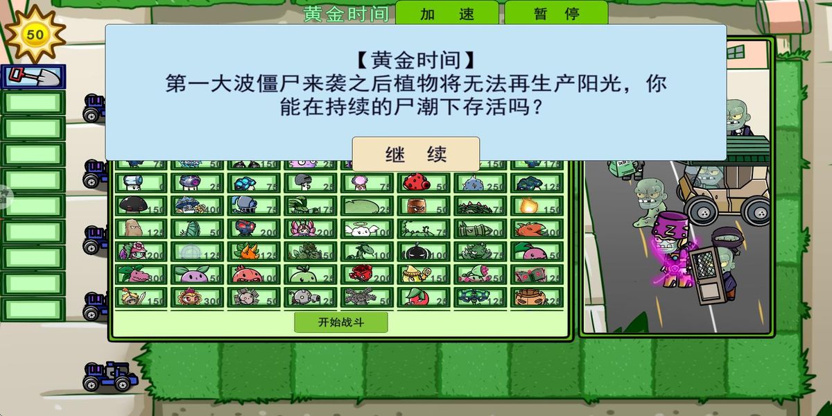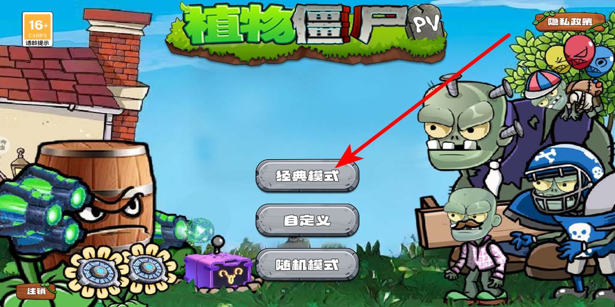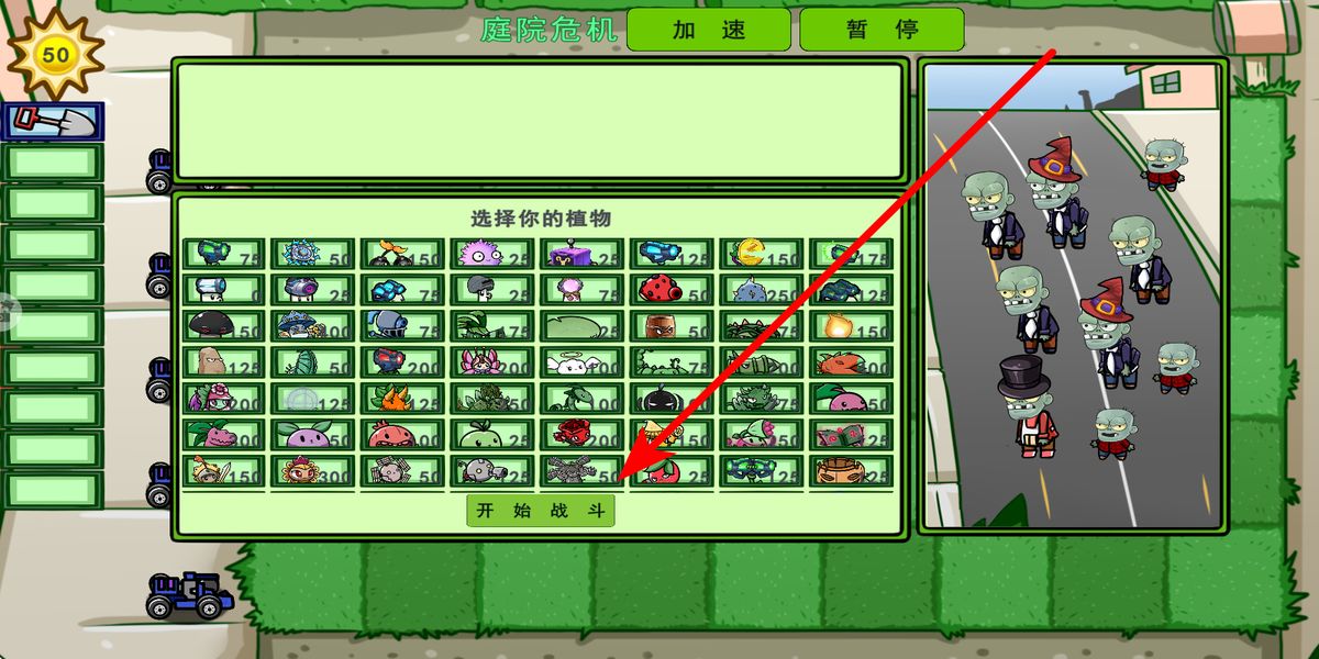 1、主界面点击经典模式,跳转植物选择页,依据初始阳光50与僵尸类型,挑选攻击、产阳光植物,点击开始战斗进入庭院危机战局。