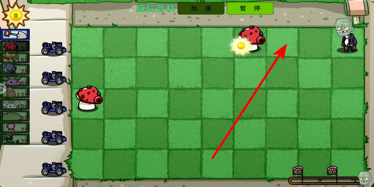 2、战斗时优先种植产阳光植物界面左侧植物,保障资源供给,再在前线格子布置攻击植物蘑菇,阻挡僵尸推进,留意僵尸动向调整种植位置。