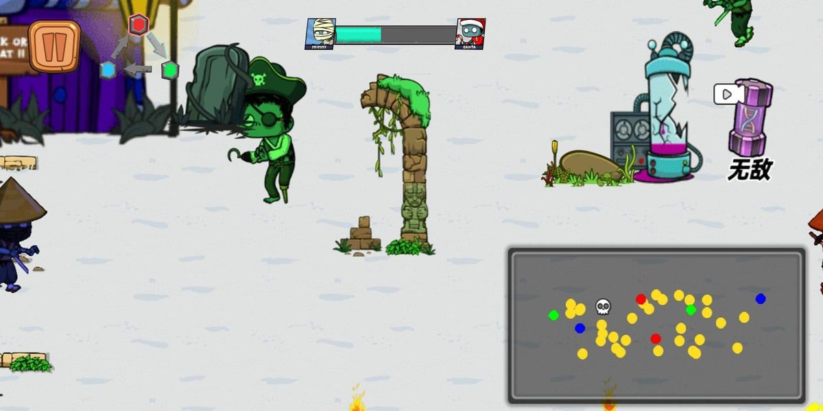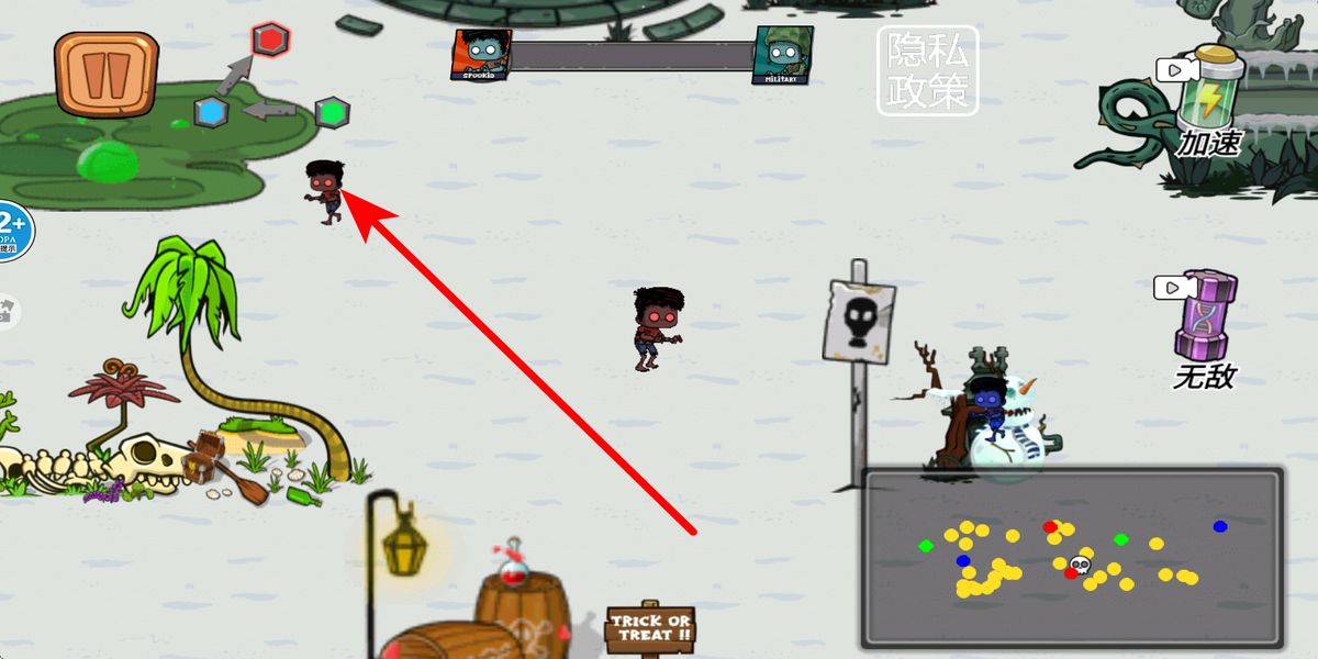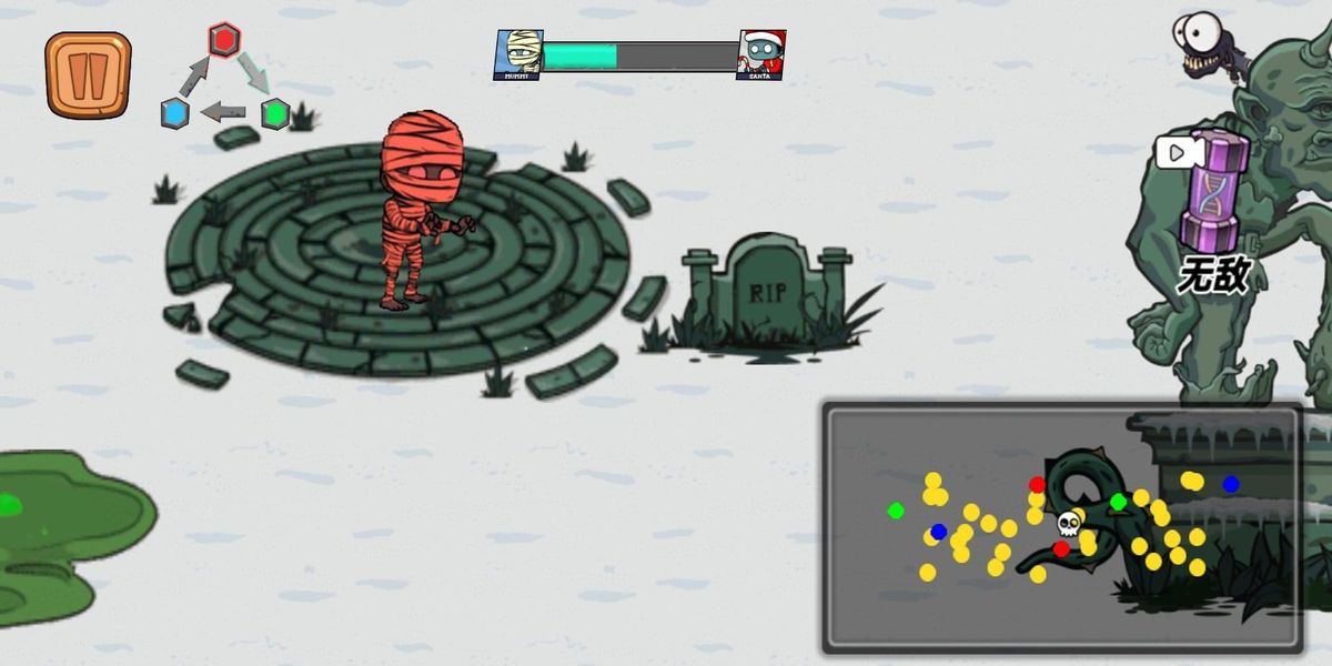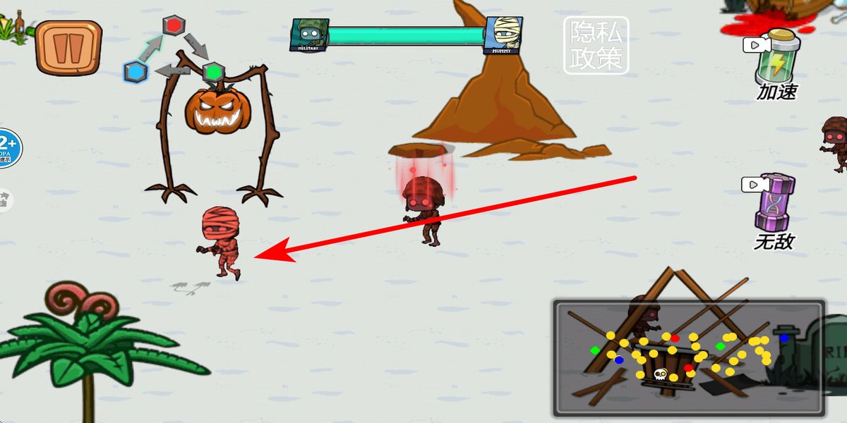 2、操控僵尸在场景移动,留意地形陷阱,遭遇南瓜怪、木乃伊等敌人时,利用道具增益或近身攻击对抗,把握时机闪避,维持战斗节奏。