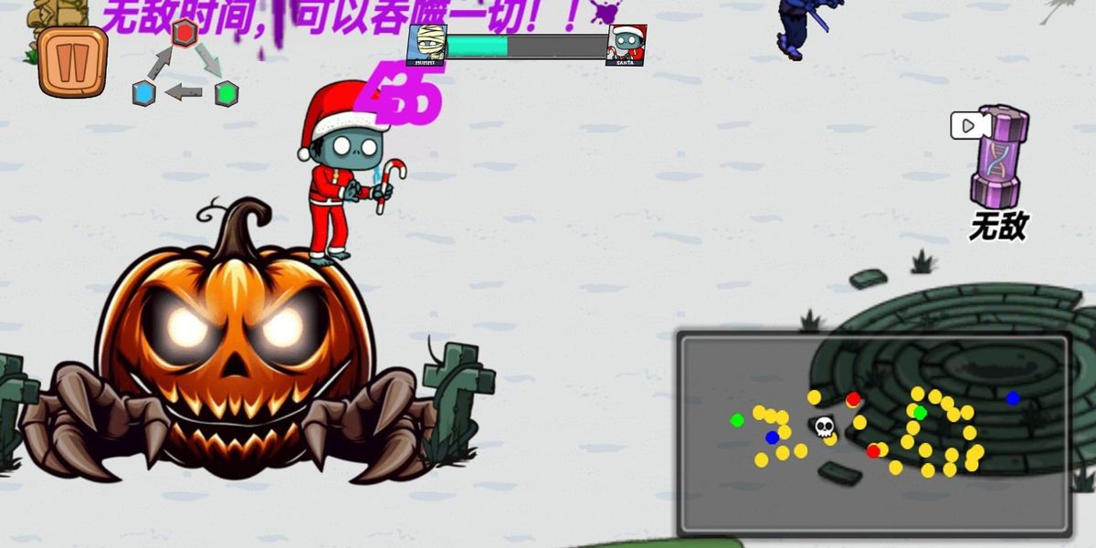 1、吞噬弱小升级:进入场景后识别等级低于自身的僵尸,滑动屏幕控制移动靠近并吞噬,获取能量值,积累到一定数值后自动提升等级,解锁吞噬范围。