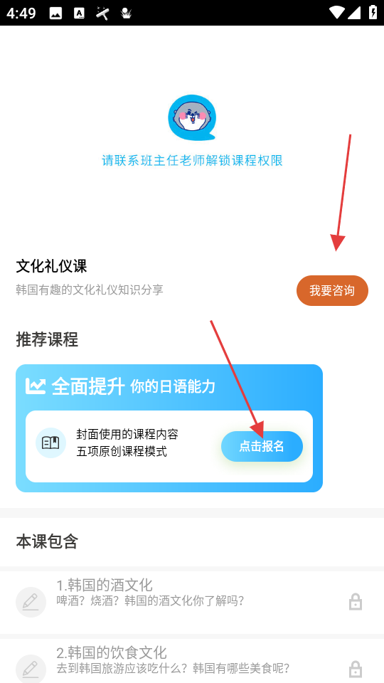 3、课程详情页,可联系老师解锁权限,对推荐课程点击报名,查看本课包含内容。