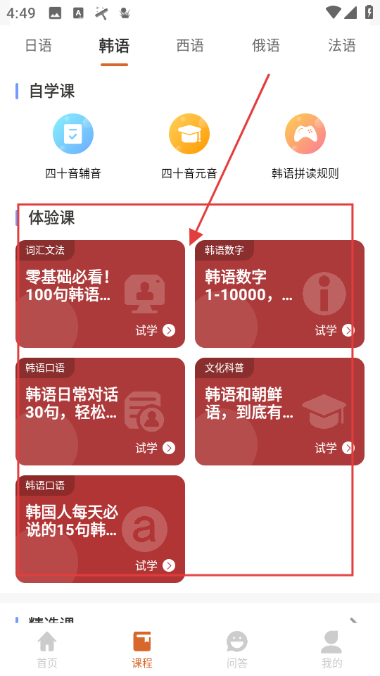 2、进入课程页选韩语,查看体验课里不同主题课程卡片,点击试学体验课程。
