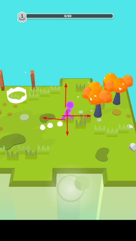 1、操控紫色角色在场景移动,收集地面白色球体,积累经验,开启闯关进程。