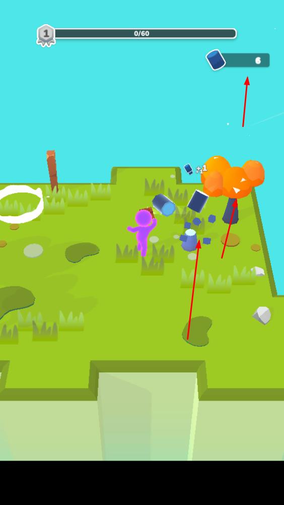 2、破坏场景树木、桶类物件,获取道具,关注上方收集目标,推进关卡任务。