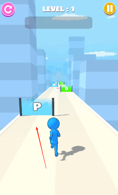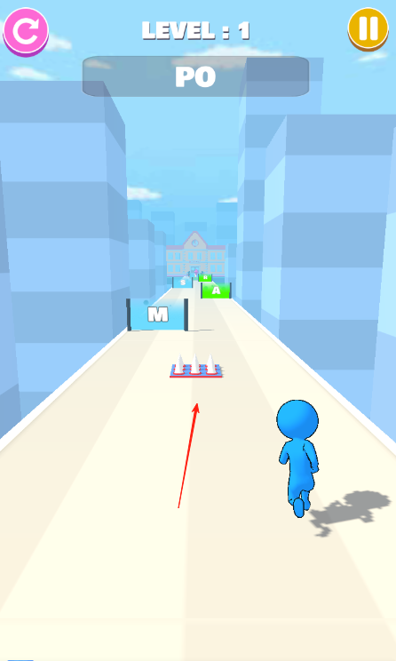 1、在【LEVEL:1】关卡,滑动屏幕操控蓝色小人前进,躲避跑道上的障碍物,如红箭头所指的锥形桶。