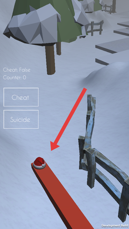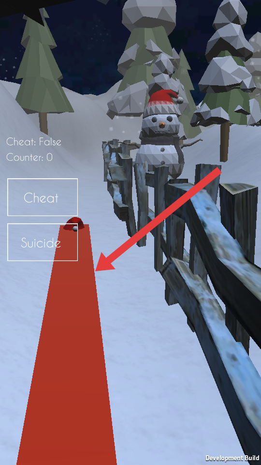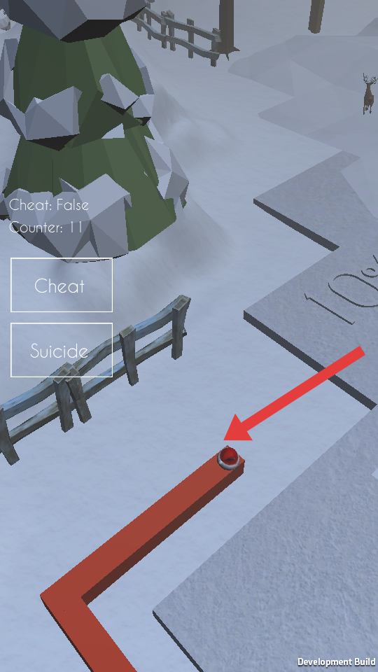 3、持续沿红色路径探索雪地,穿过栅栏、绕过树木,留意Development Build开发标识下的场景细节。