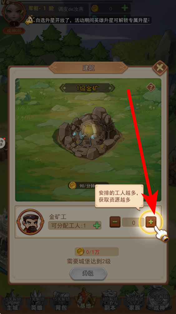 1、界面中可建造标识处点击,进入建筑选择,如建1级金矿,了解其资源产出速度,分配工人提升获取量,同时留意建筑升级条件,像金矿需城堡2级才能升级。