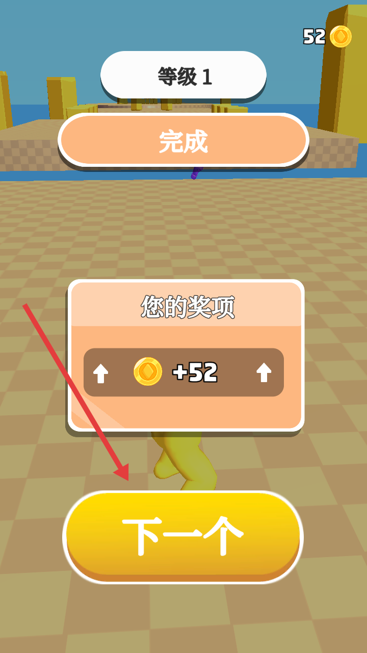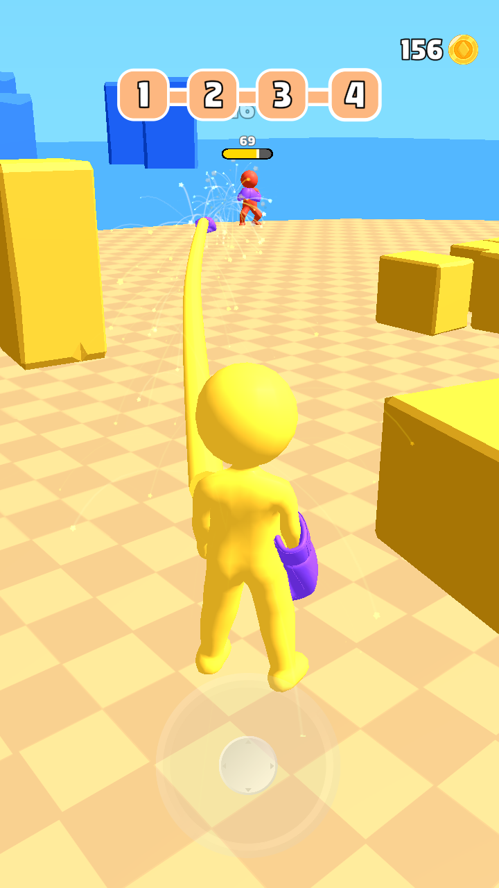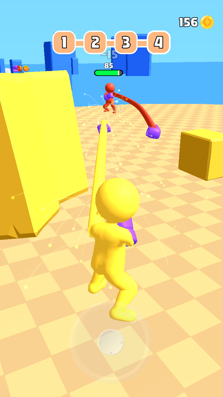 3、等级1完成后,点击下一个进入新关卡,操控黄色角色,利用紫色拳套攻击敌人,紧盯目标,释放连击。