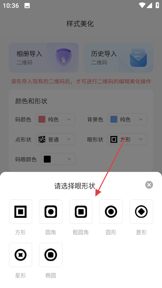 2、点击眼形状选项,弹出窗口,选择方形,圆形等眼形状进行设置。