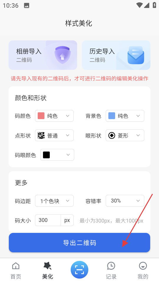 3、完成颜色,形状等设置后,点击导出二维码,生成美化后的二维码。