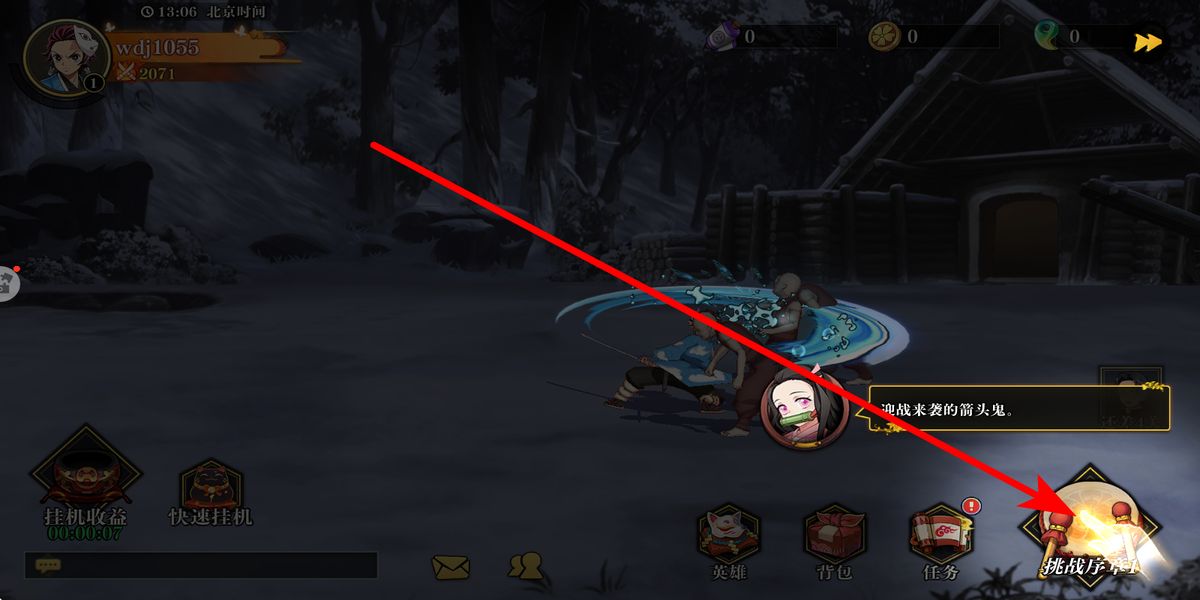 1、触发序章主界面右下角点击挑战序章按钮,接取迎战来袭的箭头鬼任务,进入战前准备阶段,正式开启冒险首战流程。
