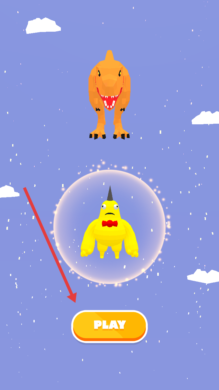 1、点击下方橙色PLAY按钮,进入游戏,操控带红领结、黑尖角的黄色怪物,准备在水上场景挑战,避开上方橙色恐龙。