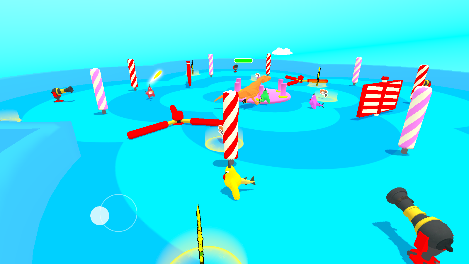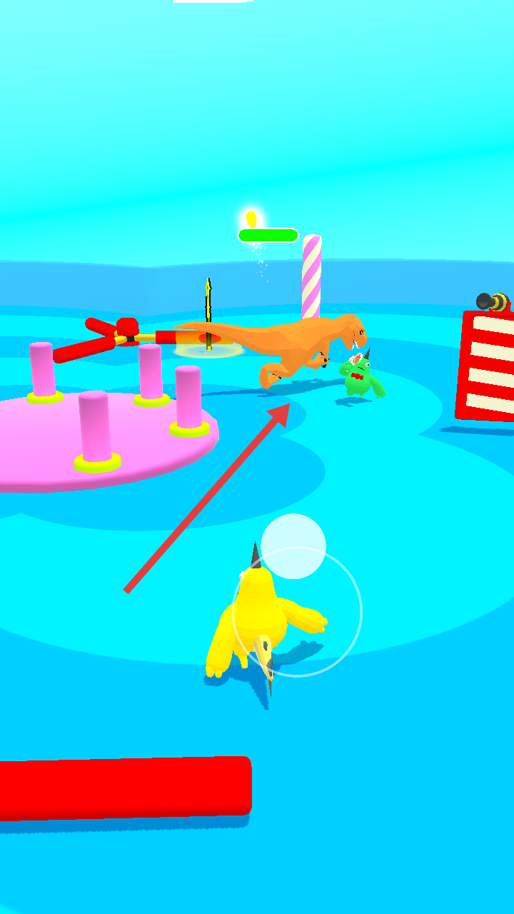 2、进入关卡,用虚拟摇杆控制黄色怪物移动,绕开粉色柱子、红色障碍,避开橙色恐龙和绿色小怪,沿箭头方向小心前行,别让恐龙攻击到。
