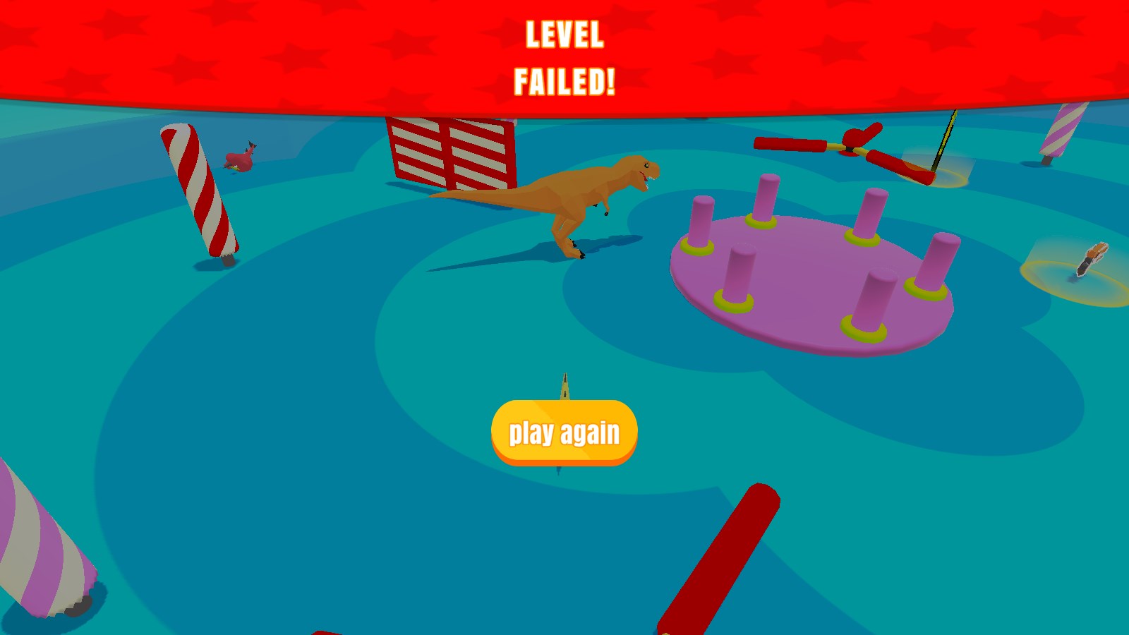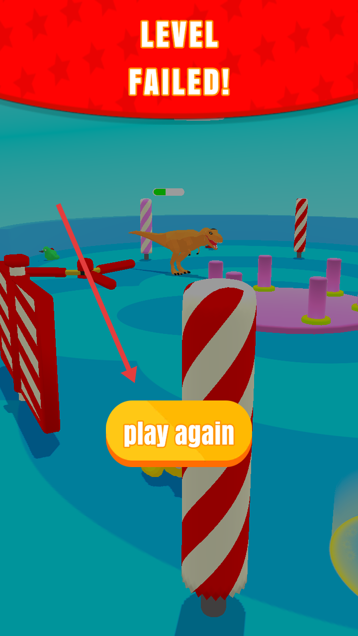 3、若挑战失败出现LEVEL FAILED,点击play again重新开始,调整移动路线,更灵活躲避恐龙,尝试成功通关。
