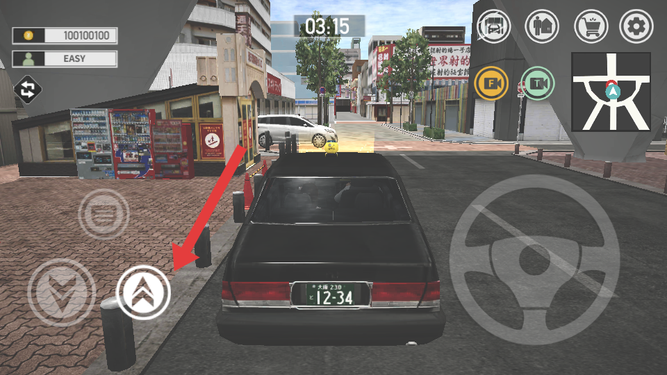 1、进入游戏后,通过方向盘按钮控制出租车转向,点击加速键启动车辆,在路边等待乘客上车。