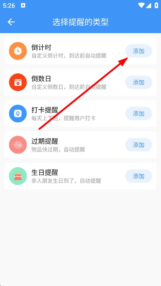 2、进入选择提醒的类型页面,可选择如倒计时等提醒类型,点击对应添加按钮。