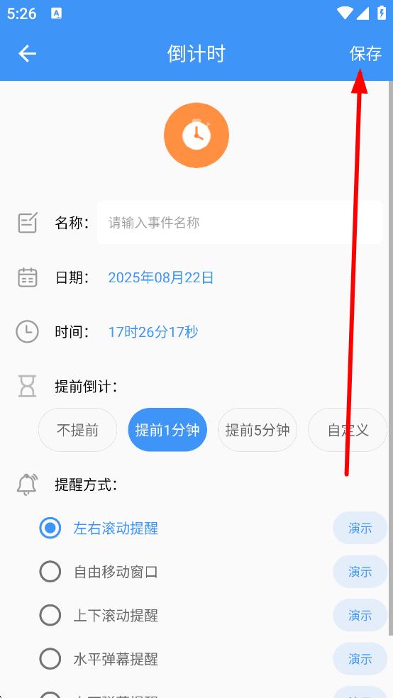 3、在倒计时设置页面,设置事件名称、日期、时间等信息后,点击右上角保存,即可保存倒计时提醒。