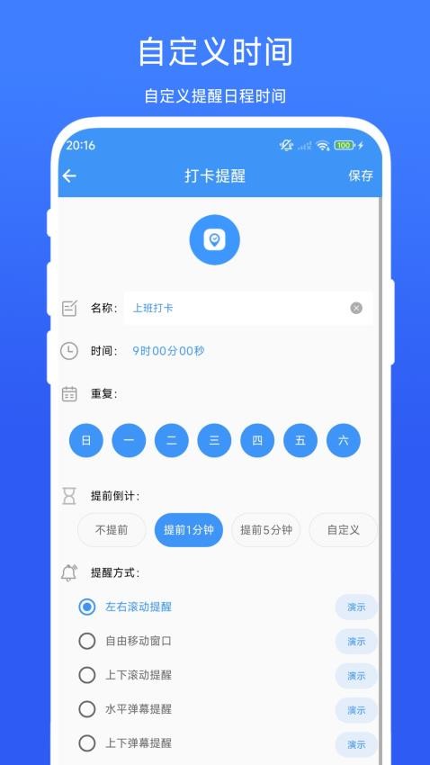 2、个性设置丰富:支持自定义提醒铃声、重复频率、显示样式等参数,可根据个人使用习惯调整软件功能,让每一位用户都能拥有贴合自身需求的使用体验,增强软件的适配性。