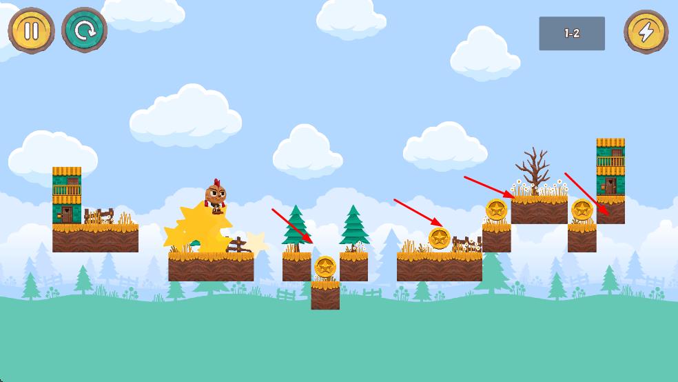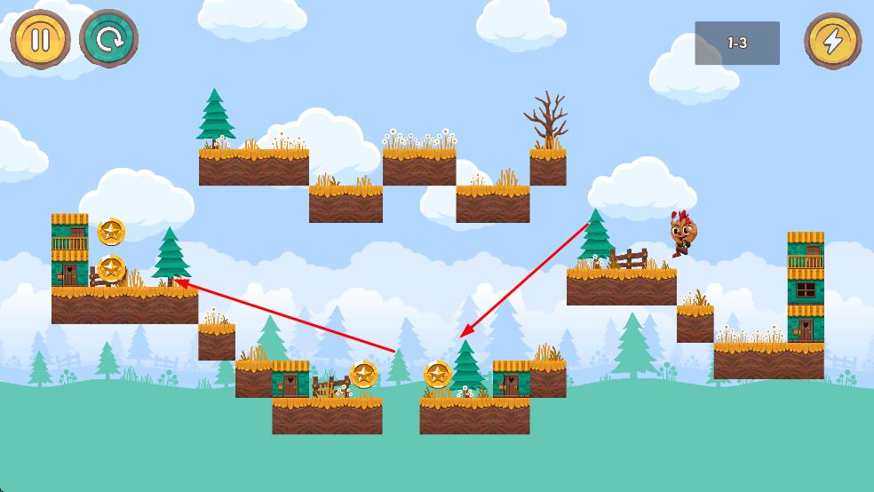 2、持续收集场景内金币,留意地形变化,借助跳跃越过沟壑等障碍,向关卡终点房屋前进。
