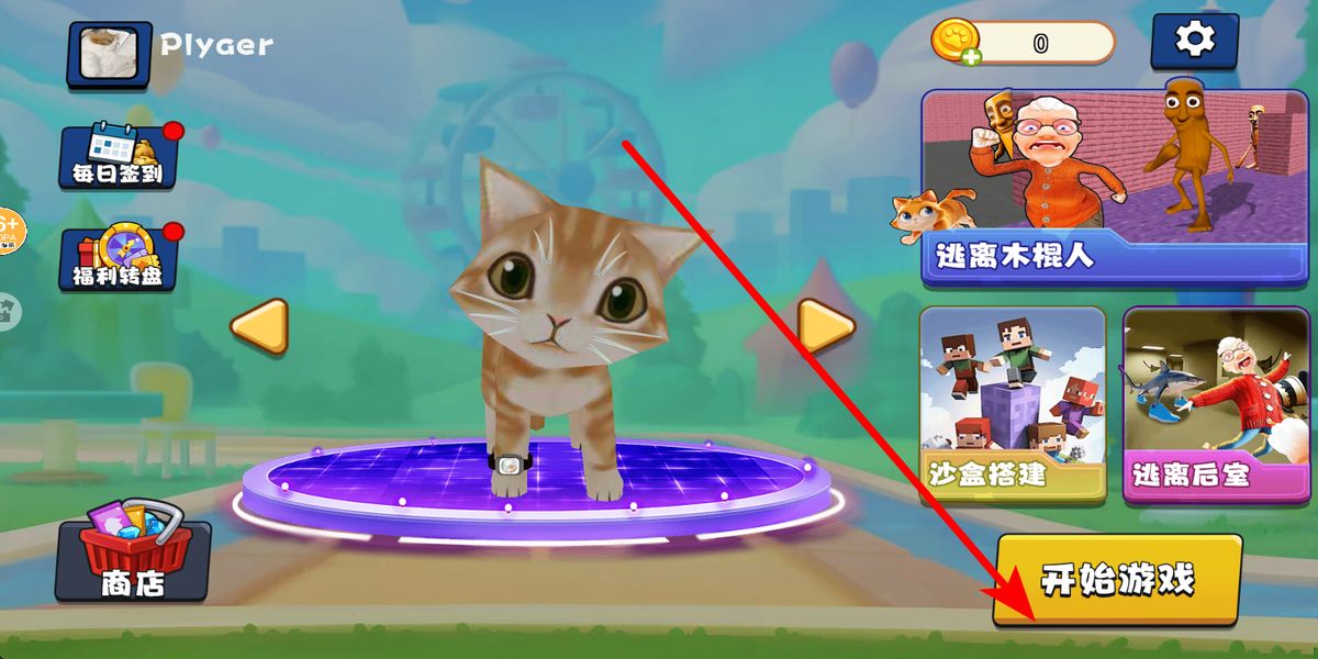1、主界面启动点击右下角开始游戏按钮,进入任务选择界面,可参与逃离木棍人等挑战,每日签到领奖励、福利转盘抽资源,助力猫咪能力养成。