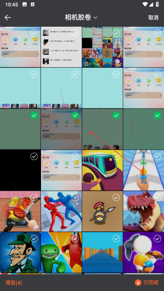 2、在图片选择界面勾选想要拼接的图片,选好后点击右下角已完成的按钮进入编辑界面。