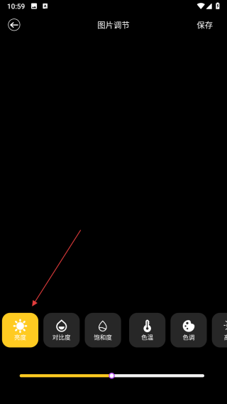 3、进入图片调节界面后,点击左下角亮度图标,拖动下方进度条即可调节图片亮度,完成后点击保存。