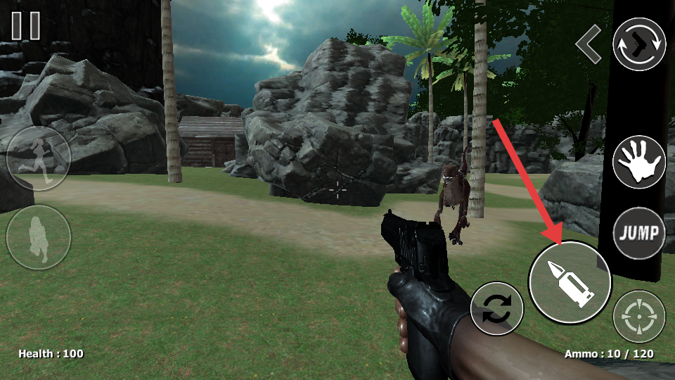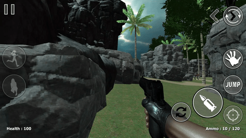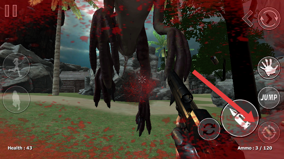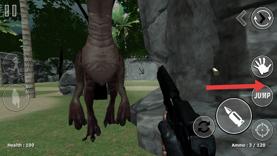 2、若恐龙靠近身体,点击跳跃按钮躲避其扑击动作,同时点击右侧的换弹按钮进行换弹,利用场景中地形。