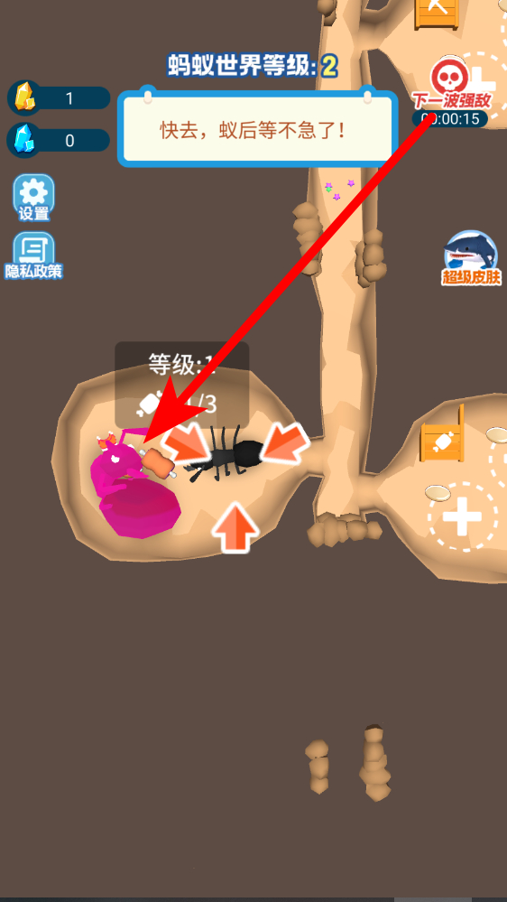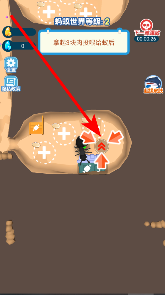1、投喂蚁后任务界面提示拿起3块肉投喂给蚁后,点击角色旁向上箭头标识,控制蚂蚁移动至肉块区域,靠近后拾取肉块,再返回蚁后所在位置完成投喂。