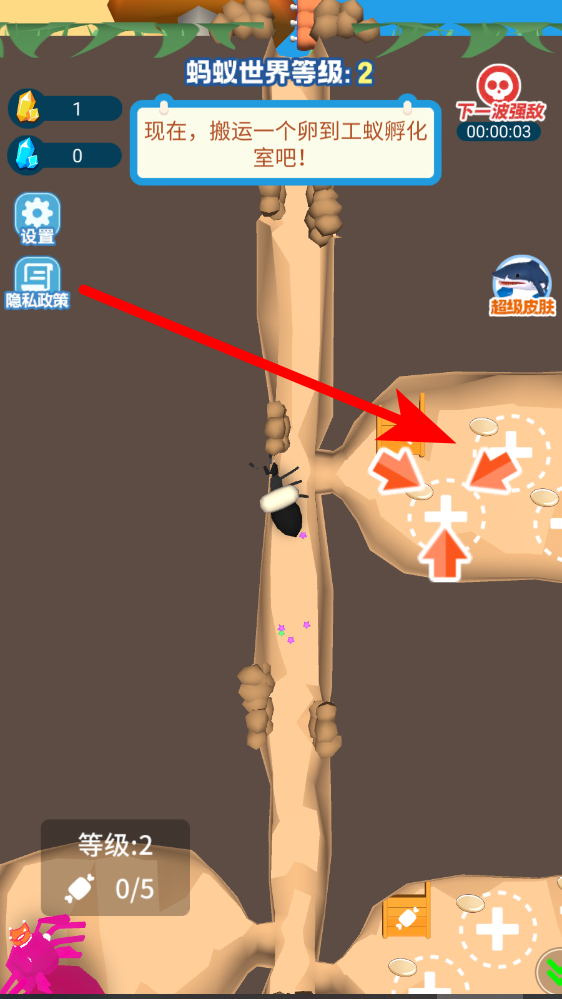 3、搬运蚁卵孵化完成前序任务后,界面提示搬运一个卵到工蚁孵化室,找到蚁卵位置,控制蚂蚁靠近拾取,沿通道移动至孵化室区域,放置卵完成任务。