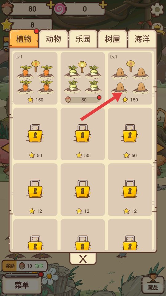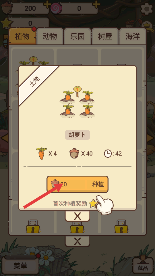 3、未知区域探索玩法:解锁探索区域后,点击进入场景,通过点击画面中的互动点寻找隐藏的神秘物品,收集物品可解锁新的作物品种或场景装饰。