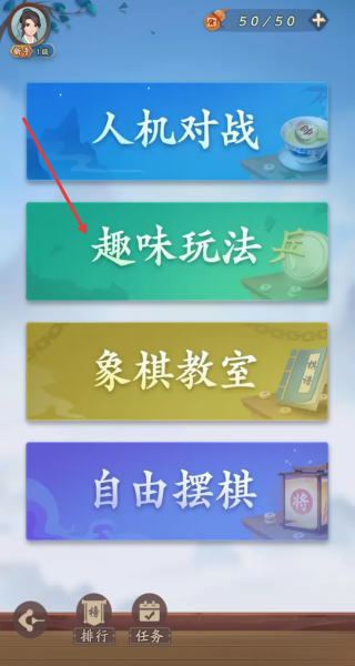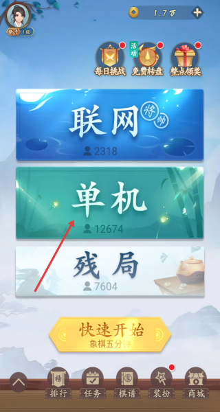 1、进入游戏后,在主界面选择“单机模式”或“联机玩法”,初次体验可先从单机模式的入门难度开始,熟悉象棋基础走法与规则。