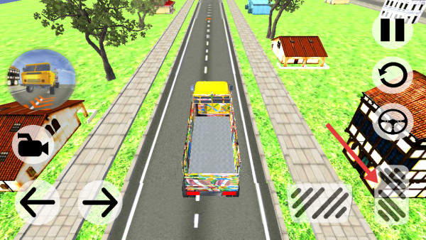 2、启动卡车后,通过屏幕虚拟按键控制方向、油门与刹车,按照导航路线行驶,途中留意交通标志与路况变化,避开障碍物与其他车辆。