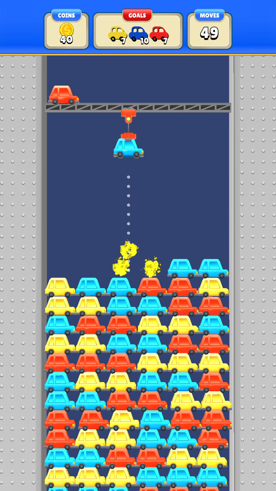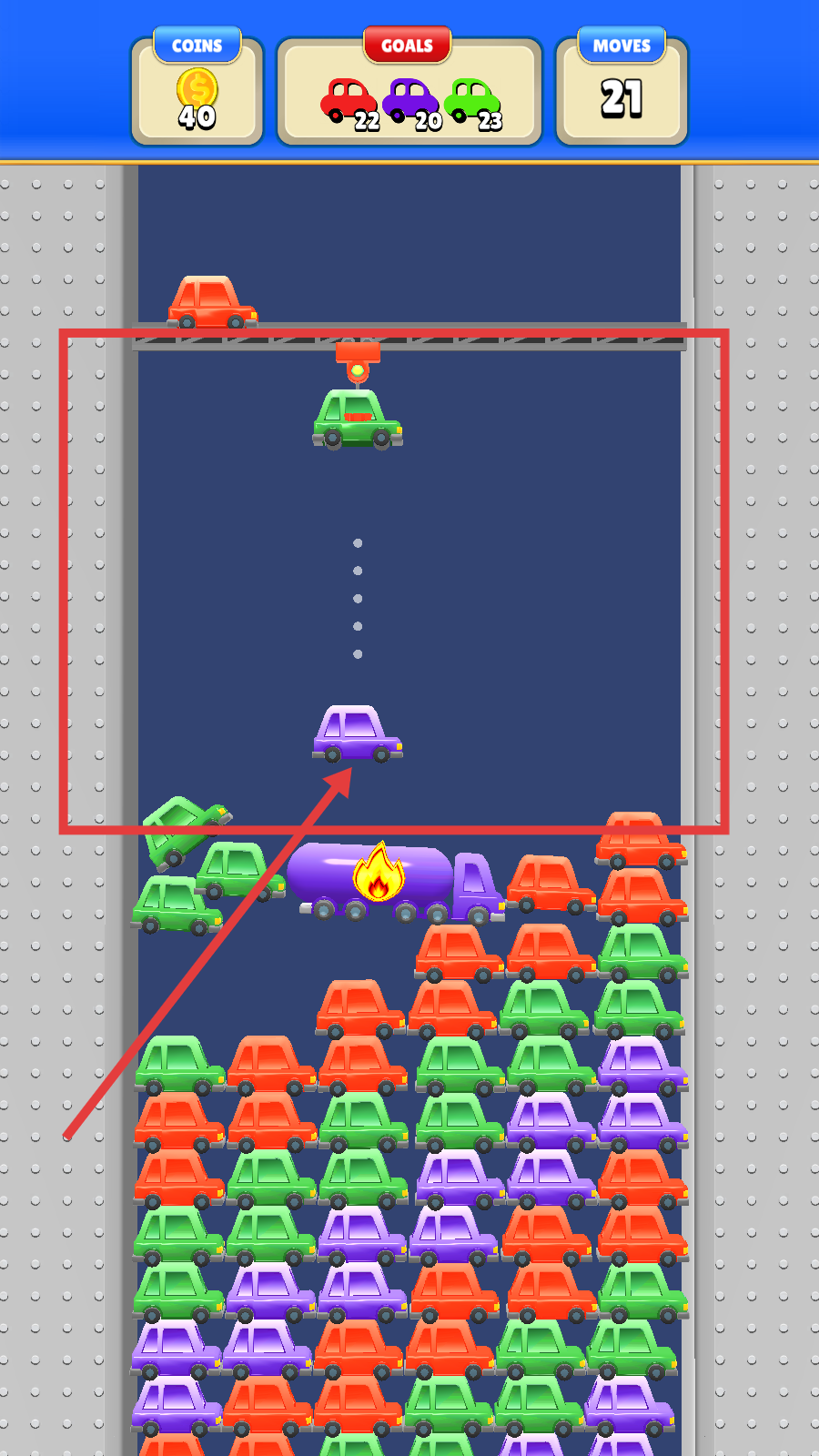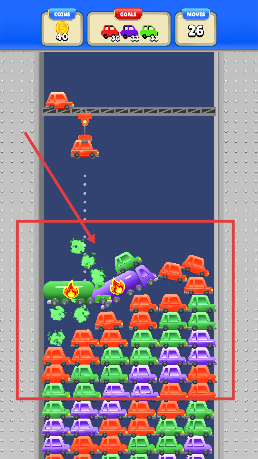 2.操作:通过吊车投放车辆,优先让同色车聚集(如红色车落位后,与下方红色车连成线消除),利用带火焰的油罐车,投放后触发爆炸。