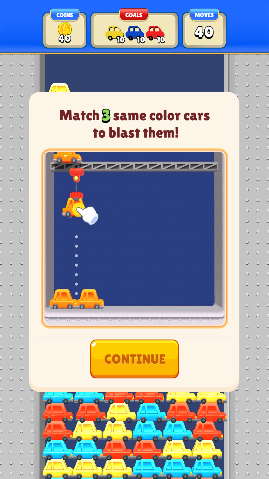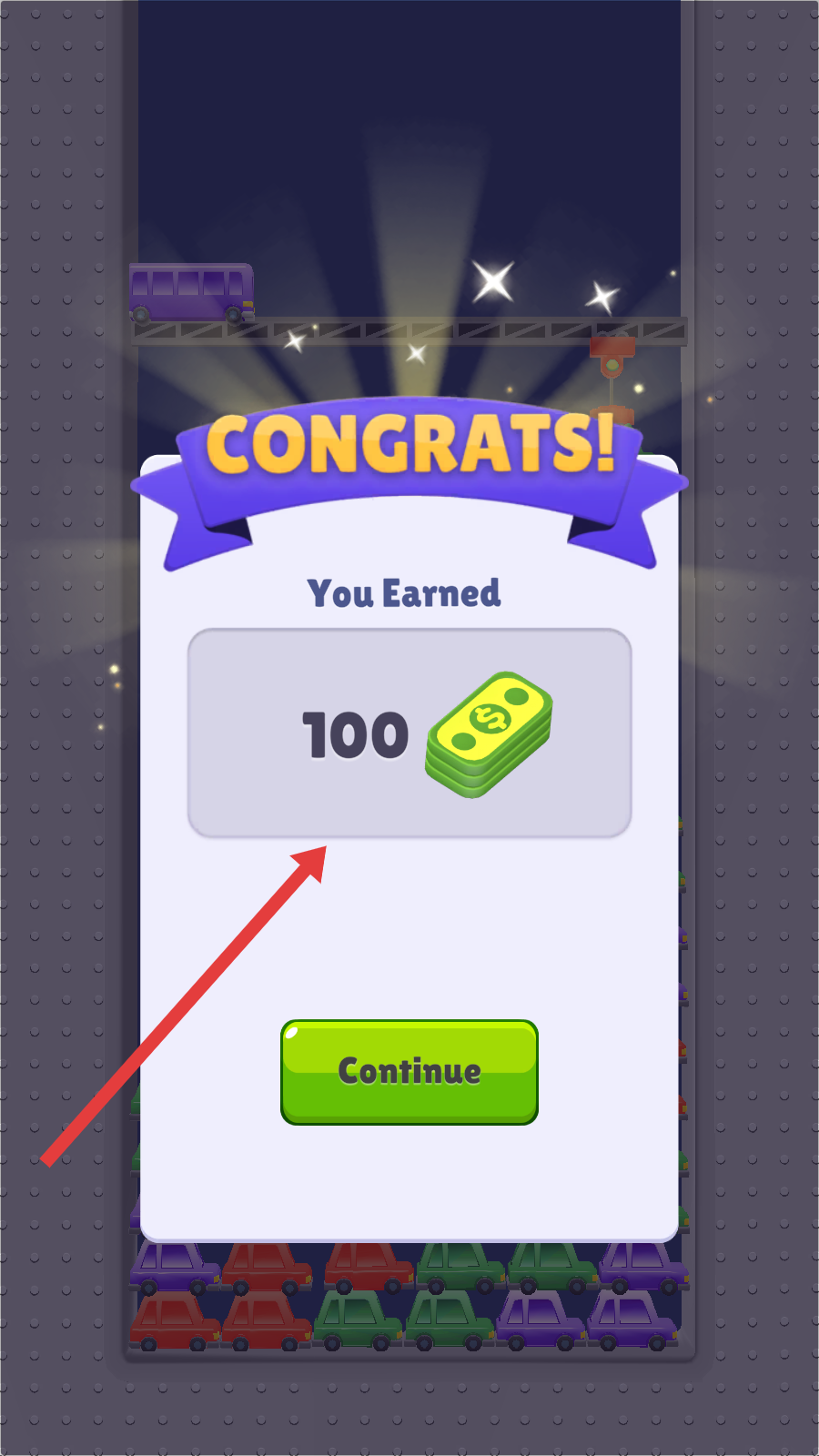3.收尾:持续调整投放策略,当三种颜色车数量满足目标后,触发结算,获得100金币,点击【Continue】进入下一关。