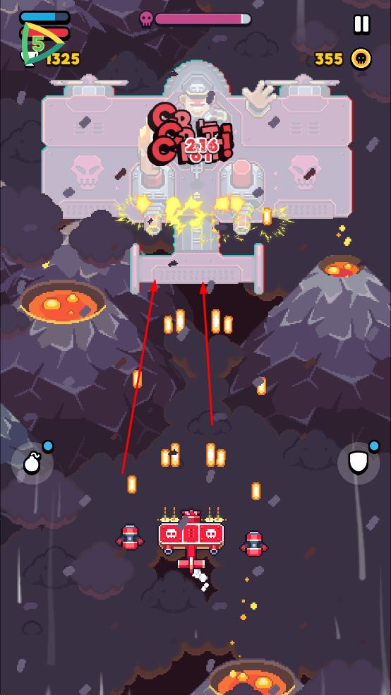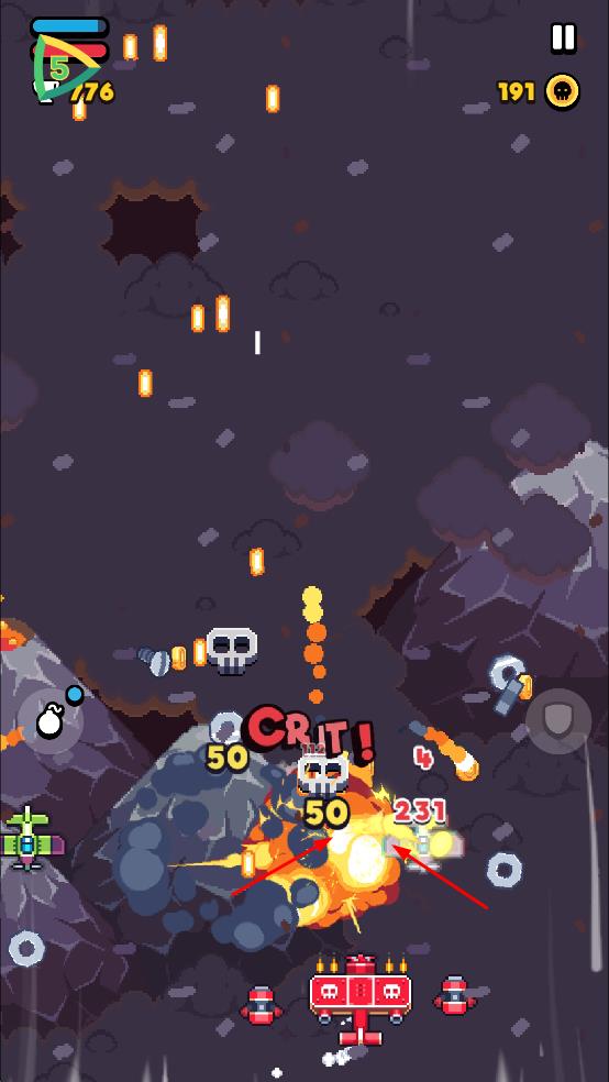 2、躲避弹幕,攻击敌人触发暴击,收集金币骷髅图标。