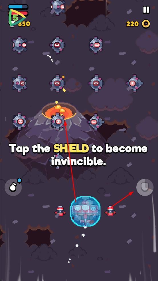 3、点击右侧盾牌图标,进入无敌状态,对抗密集敌人或BOSS。