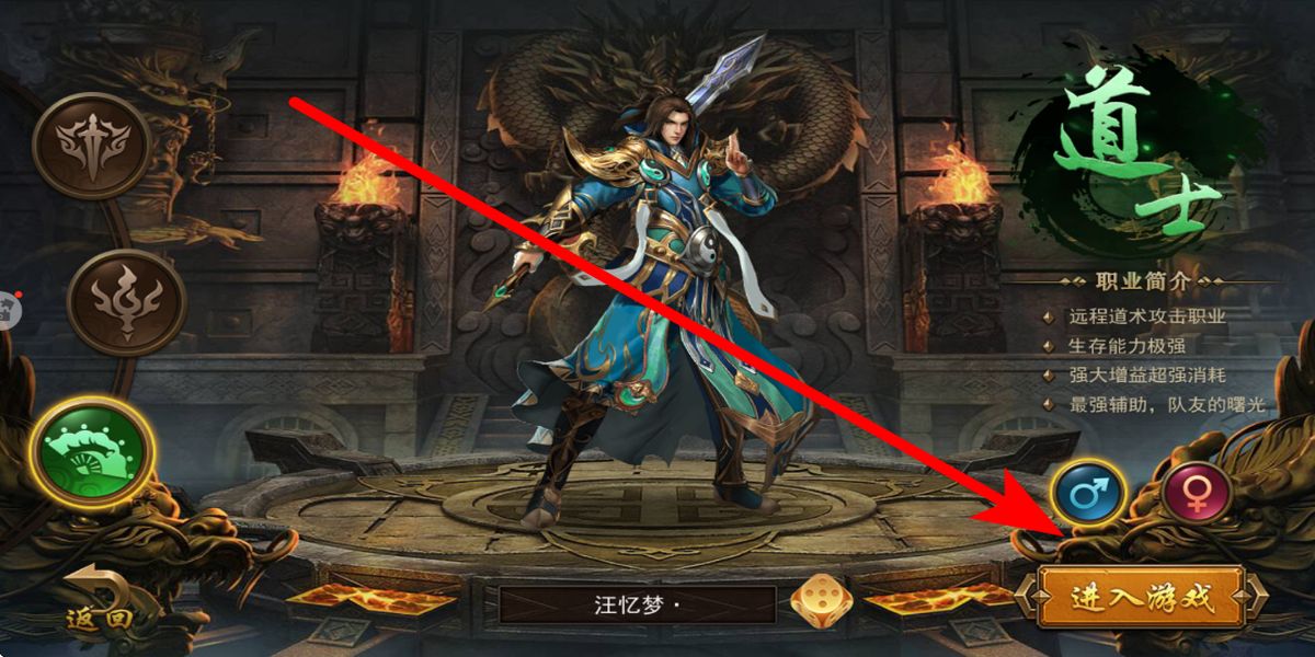 2、职业选择界面选定职业界面展示的道士,设定角色名称与性别后,点击进入游戏,完成角色创建与职业方向的初步确立。