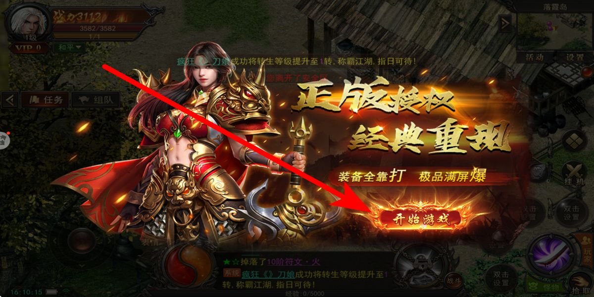 3、选择角色创建完毕后,在游戏主界面点击开始游戏按钮,正式踏入游戏世界,开启打怪爆装、攻城争霸等传奇冒险体验。