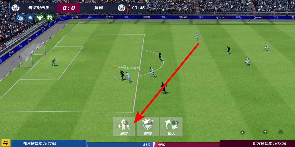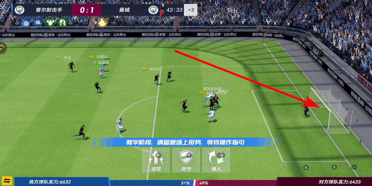 2、赛中战术切换比赛时利用下方进攻、防守、换人按钮,进攻阶段点击进攻指令,让球员压上制造攻势,防守时切换防守,收缩防线拦截,适时换人调整体力与战术。