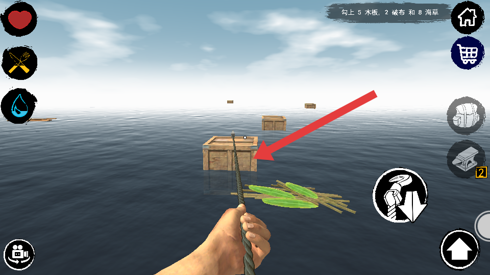 1、工具收集与工具制作:使用初始钩子蓄力勾取海上漂浮的木板、塑料、树叶等物资,根据配方合成斧头、鱼竿、矛等工具,斧头可砍伐椰子树获取资源。