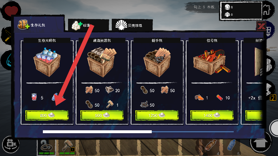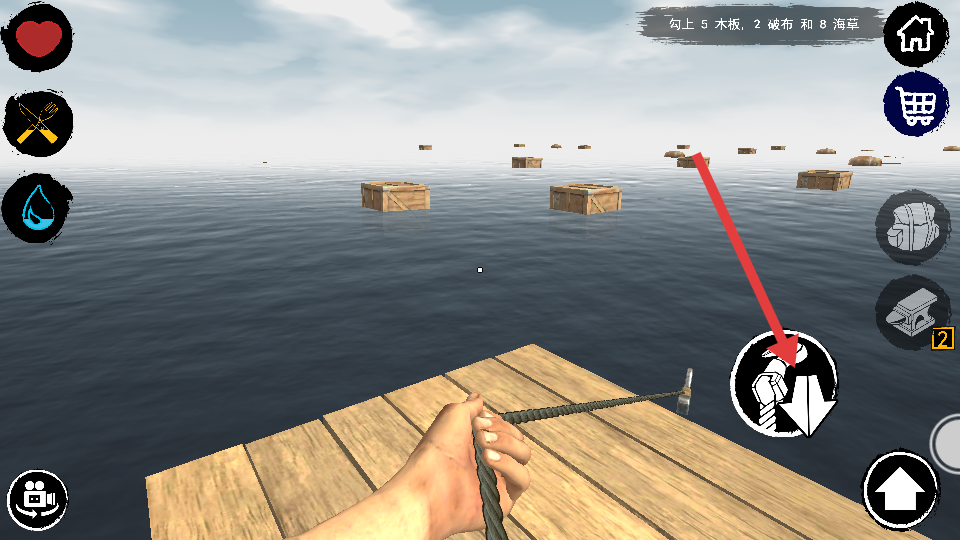 1、用钩子收集木板、破布等物资,合成工具、扩建木筏,积累生存进度,部分版本需达成特定生存目标,解锁权限。