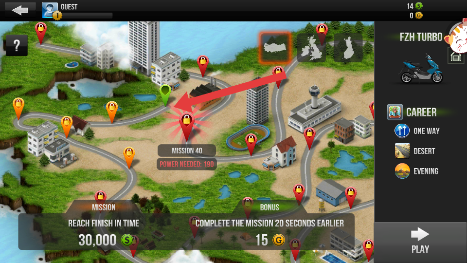 1、在地图界面选择带标记的任务点,点击PLAY进入关卡,完成REACH FINISH IN TIME限时抵达终点的目标。